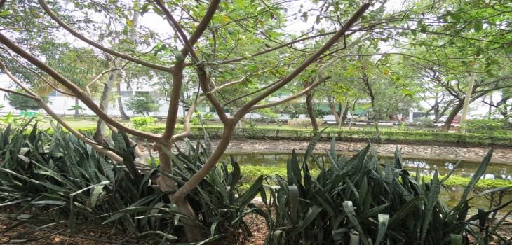 Un moderno complejo de 30 casas ecológicas a orillas del río, destacando espacios verdes compartidos y un cobertizo comunitario para botes.